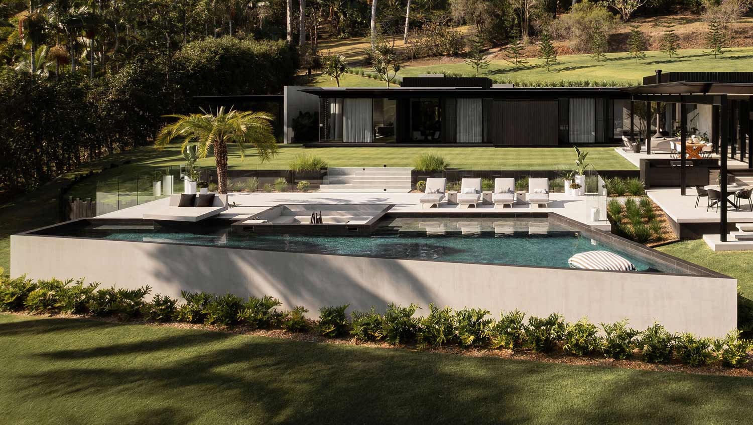 A premium residential pool installation by Clout Build and Paul Clout Design, enhancing high-end outdoor living, with hydraulic and pool plumbing services by Amber Aquatic.