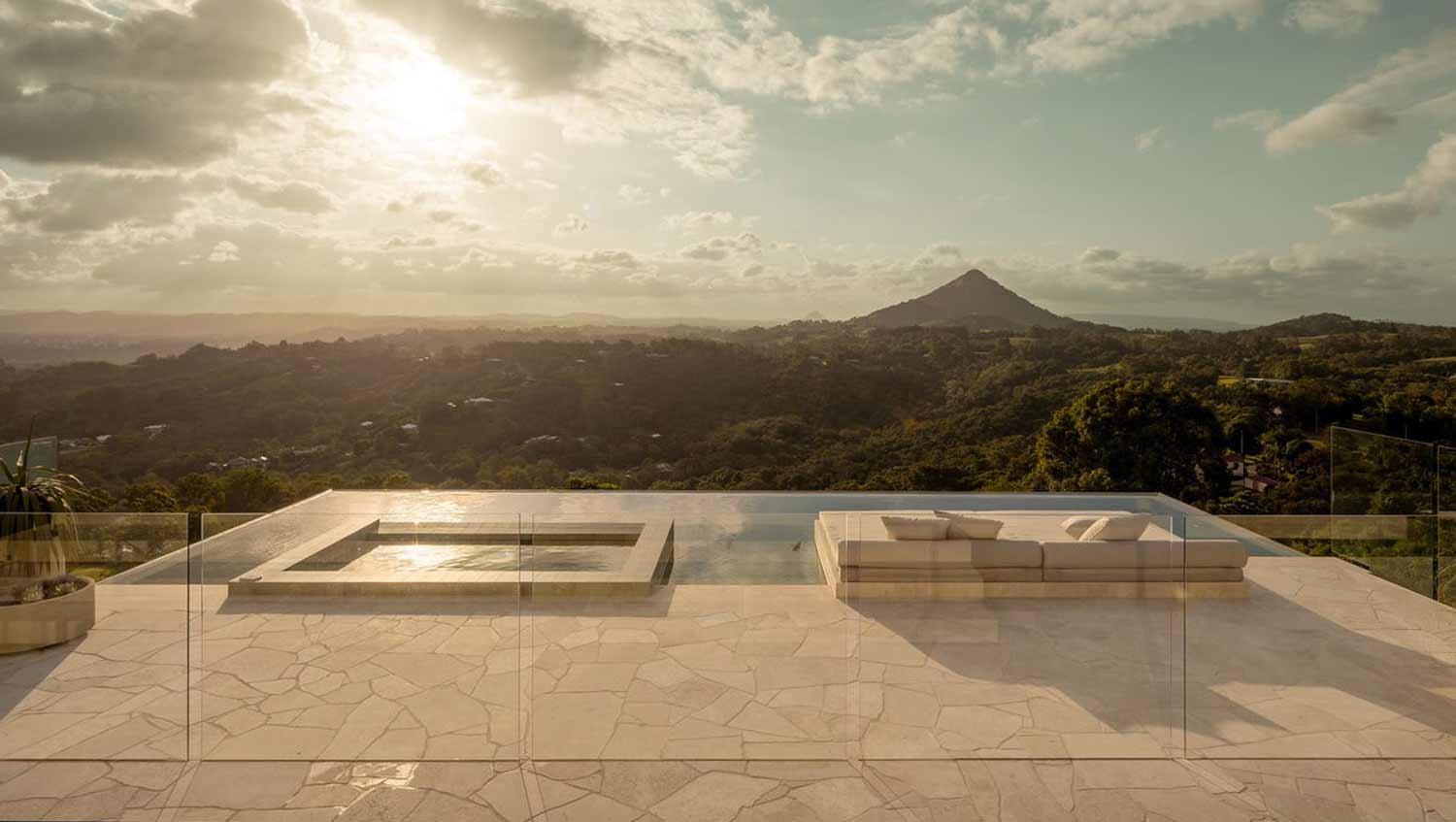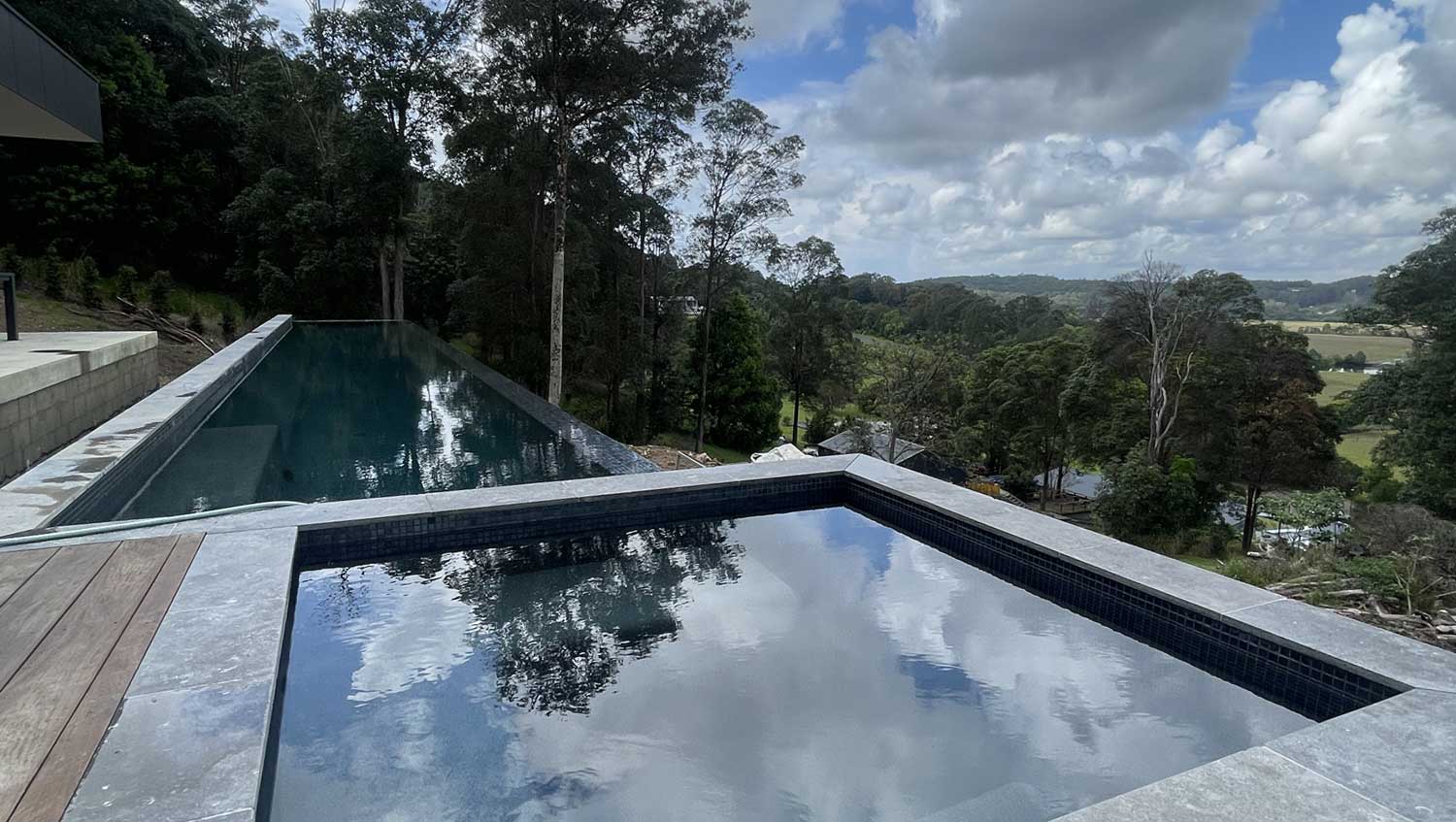 An elevated luxury pool project by Clout Build and Paul Clout Design, designed to maximise panoramic views, with precision hydraulic and pool plumbing installation by Amber Aquatic.